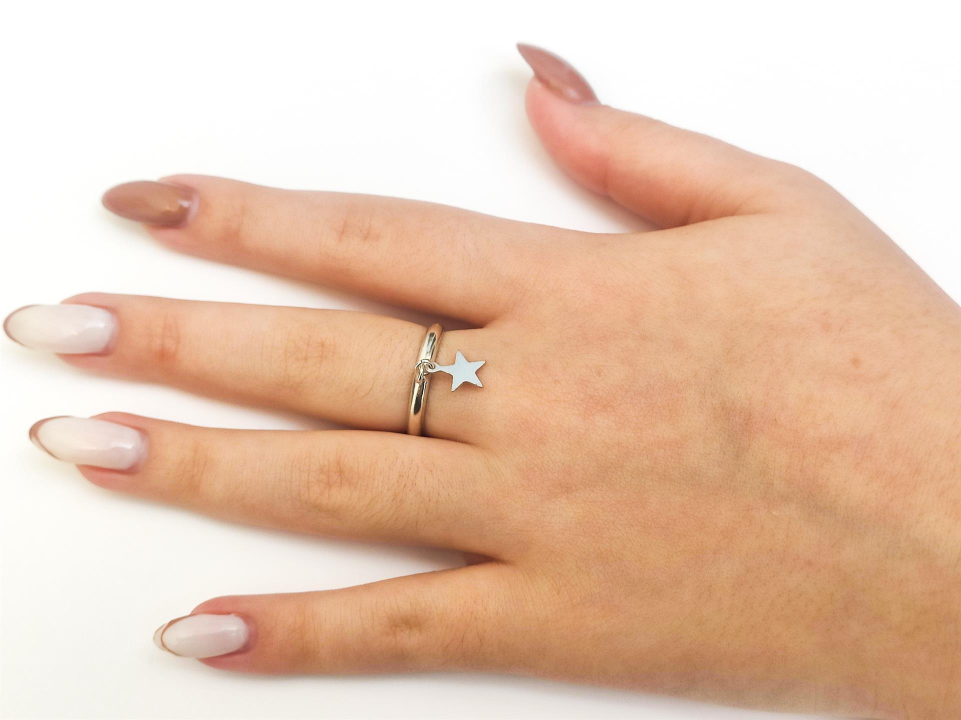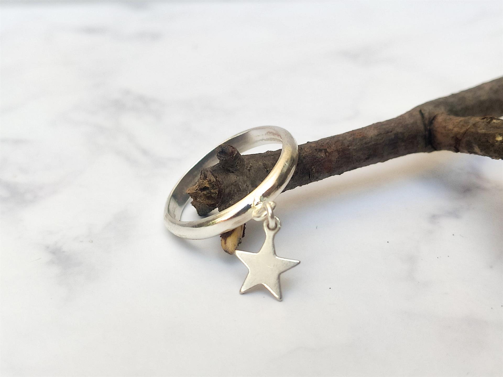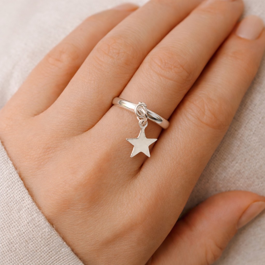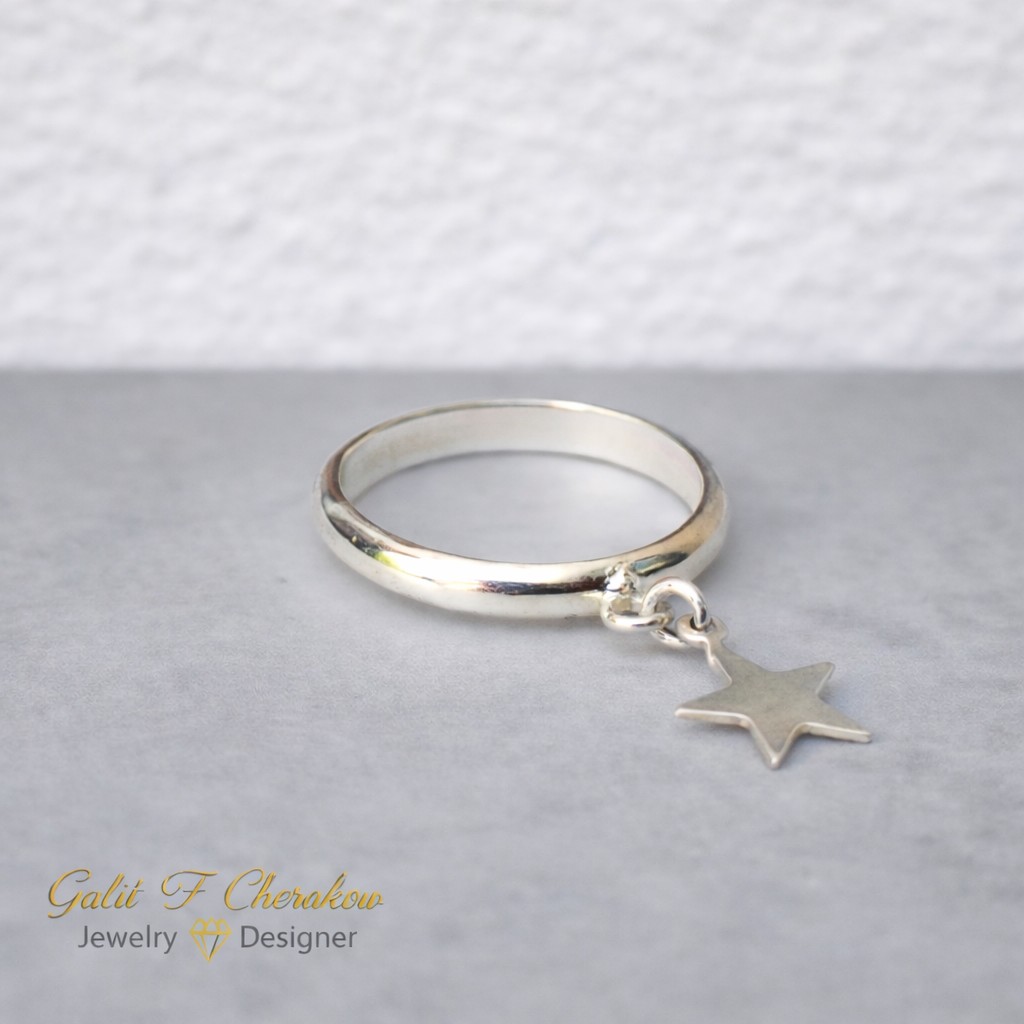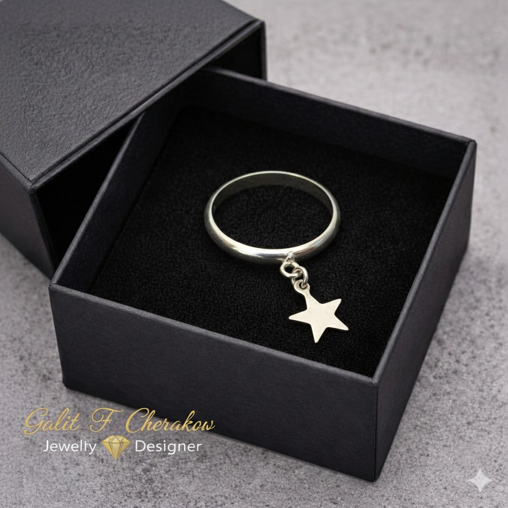 טבעת כסף עדינה ומינימליסטית עם תליון כוכב קטן מתנדנד, המעוצבת בקו נקי ואלגנטי.