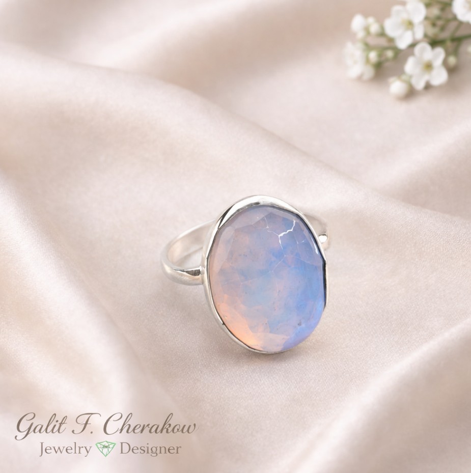 טבעת כסף בעבודת יד עם אבן אופלית אובלית בגוון חלבי־כחלחל, המשקפת אור רך ועדין המשתנה לפי זווית האור. האבן משובצת במסגרת כסף 925 בעיצוב נקי ועל־זמני, המדגיש את היופי הטבעי והעומק של האופלית.
