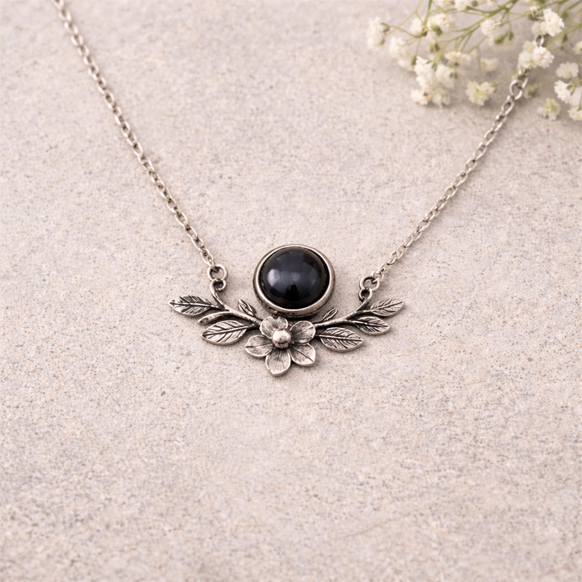 שרשרת כסף 925 בעבודת יד עם תליון פרח עדין ואבן כהה במרכז – שילוב של טבע, עומק ורוך.