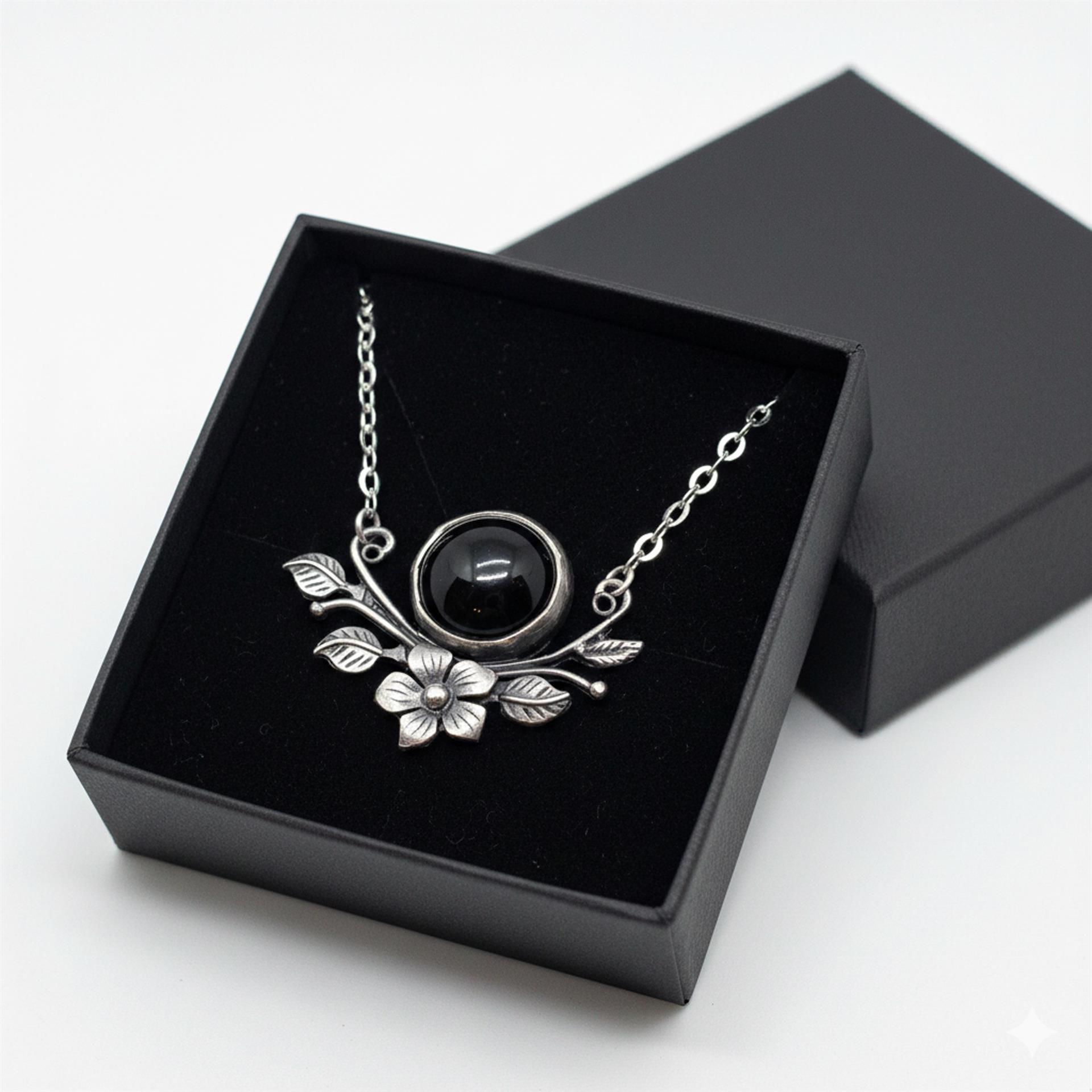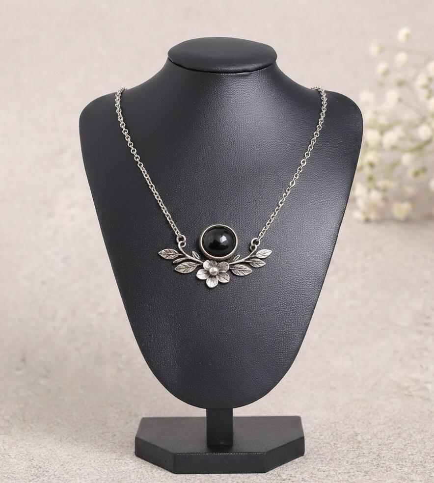 התליון מעוצב בהשראה בוטנית, עם עלים ופרח מפוסלים בקפידה, ובמרכזם אבן כהה ומבריקה שמוסיפה נוכחות שקטה ואלגנטית.