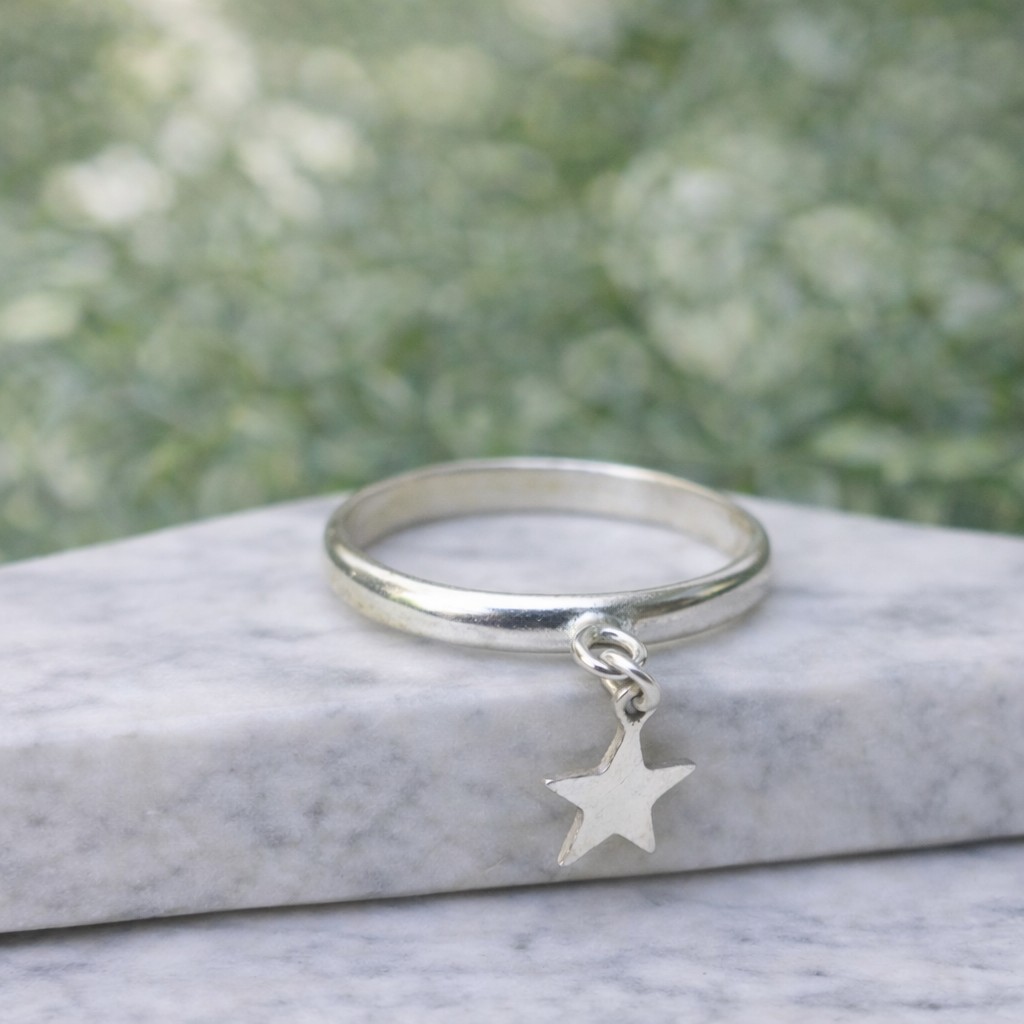 טבעת כסף עדינה ומינימליסטית עם תליון כוכב קטן מתנדנד, המעוצבת בקו נקי ואלגנטי.