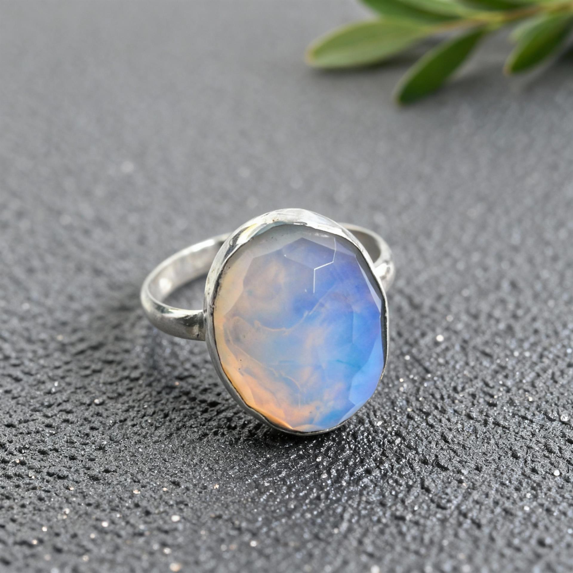טבעת כסף בעבודת יד עם אבן אופלית אובלית בגוון חלבי־כחלחל, המשקפת אור רך ועדין המשתנה לפי זווית האור. האבן משובצת במסגרת כסף 925 בעיצוב נקי ועל־זמני, המדגיש את היופי הטבעי והעומק של האופלית.