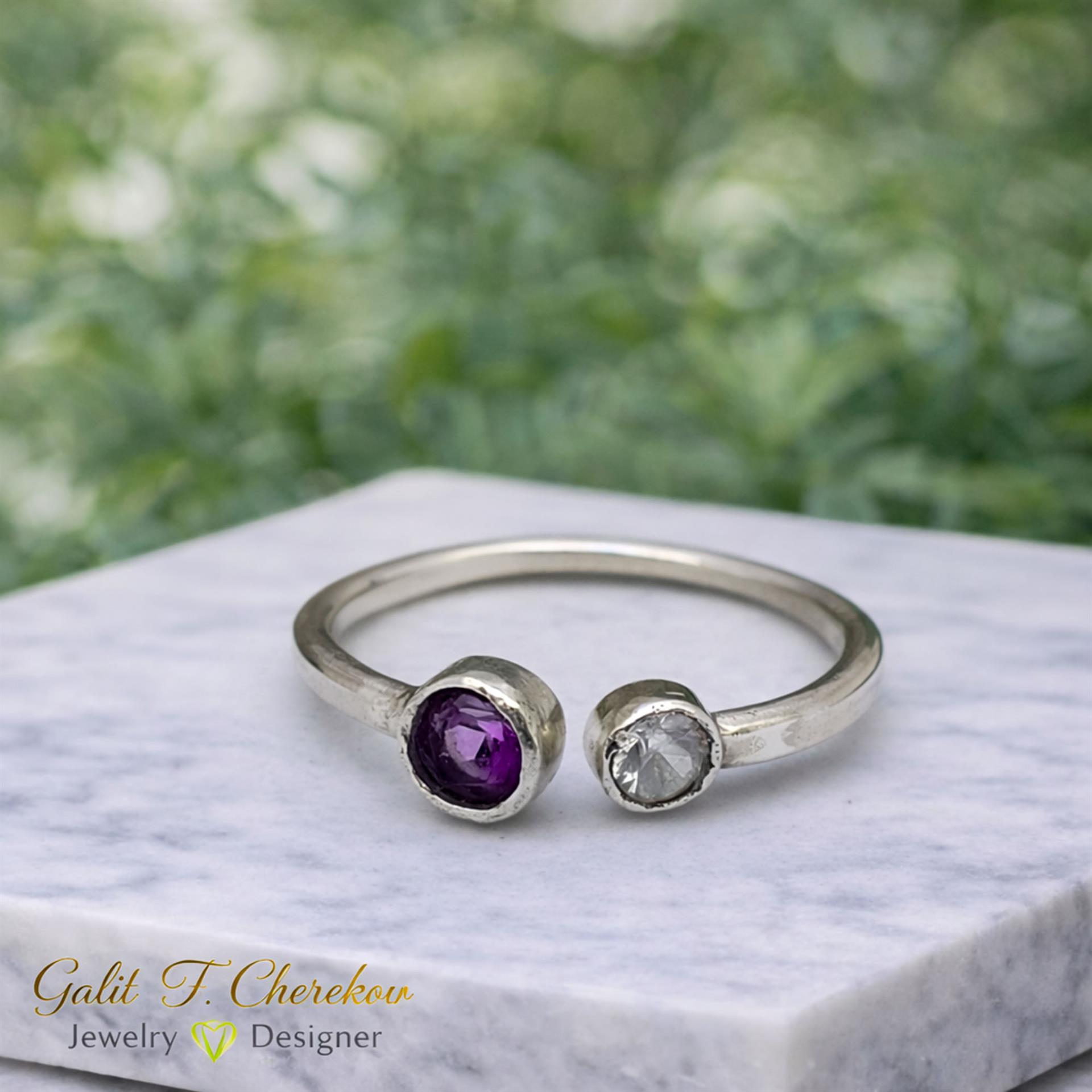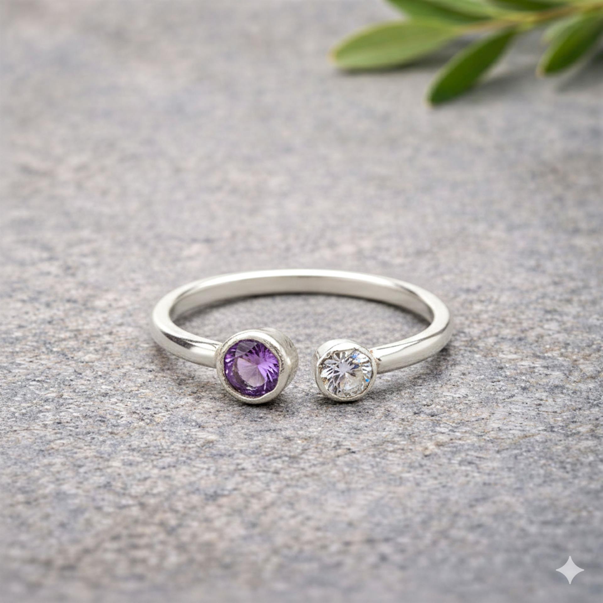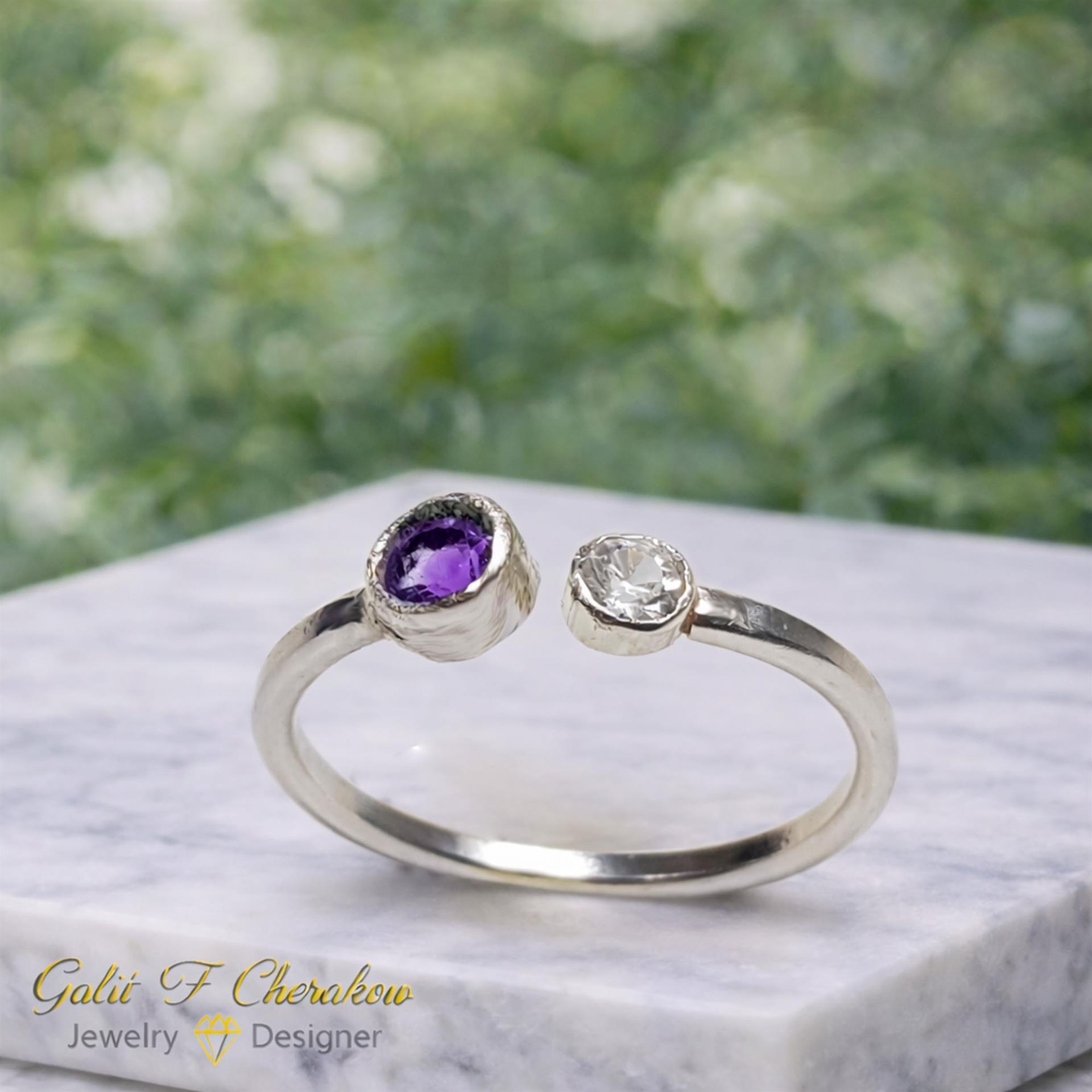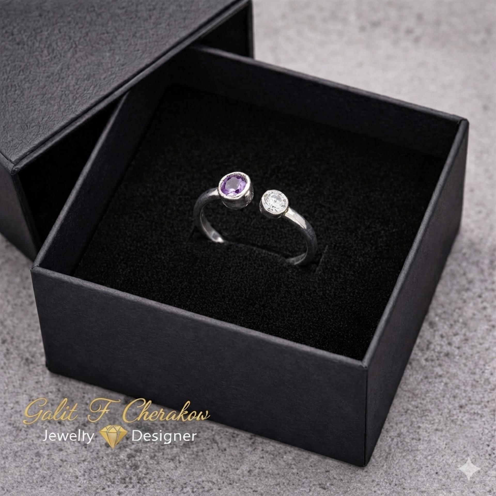 טבעת כסף 925 עדינה פתוחה עם זירקונים בצבע סגול ולבן היא פריט מושלם לכל אישה שרוצה להוסיף ניצוץ ויופי לידיה. הטבעת עשויה מכסף 925 איכותי המבטיח עמידות וקיומה לאורך זמן. העיצוב העדין והפתוח של הטבעת מעניקים לה מראה מודרני ומיוחד. הזירקונים בצבע סגול ולבן מוסיפים קסם וברק נוסף לטבעת, מעניקים לה מראה יוקרתי ומושך את העין. הטבעת מתאימה לשימוש יומיומי או לאירועים מיוחדים ותהיה מתנה מושלמת לאהובה שלך. תפסיקי לחפש, הטבעת המושלמת עבורך נמצאת כאן!