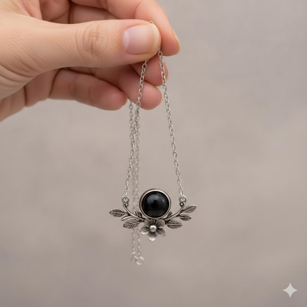 התליון מעוצב בהשראה בוטנית, עם עלים ופרח מפוסלים בקפידה, ובמרכזם אבן כהה ומבריקה שמוסיפה נוכחות שקטה ואלגנטית.