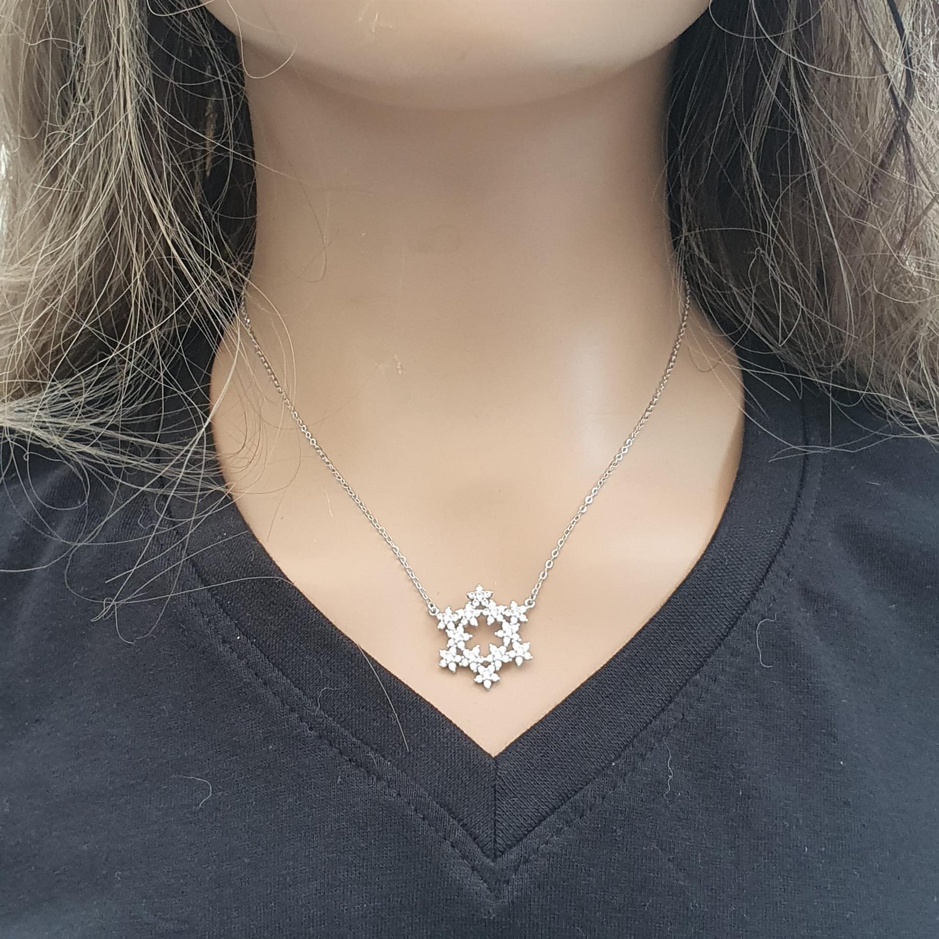 שרשרת זו משלבת את הסמל היהודי העתיק והמשמעותי של מגן דוד עם זוהר עדין ומתוחכם של אבני זירקון איכותיות. השיבוץ המוקפד של אבני הזירקון מעניק לתליון מראה אלגנטי ומרשים, המתאים ללבישה יומיומית או לאירועים מיוחדים.